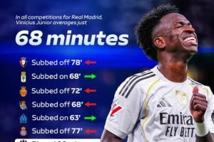 7次被换下!天空:维尼修斯至今仅3次打满全场,场均出场68分钟