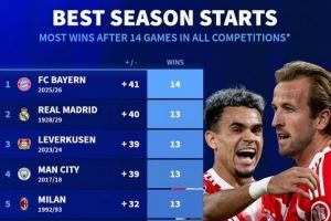 - 2025-10-31德转列五大联赛球队开局14场:拜仁全胜,皇马曼城米兰等队均13胜